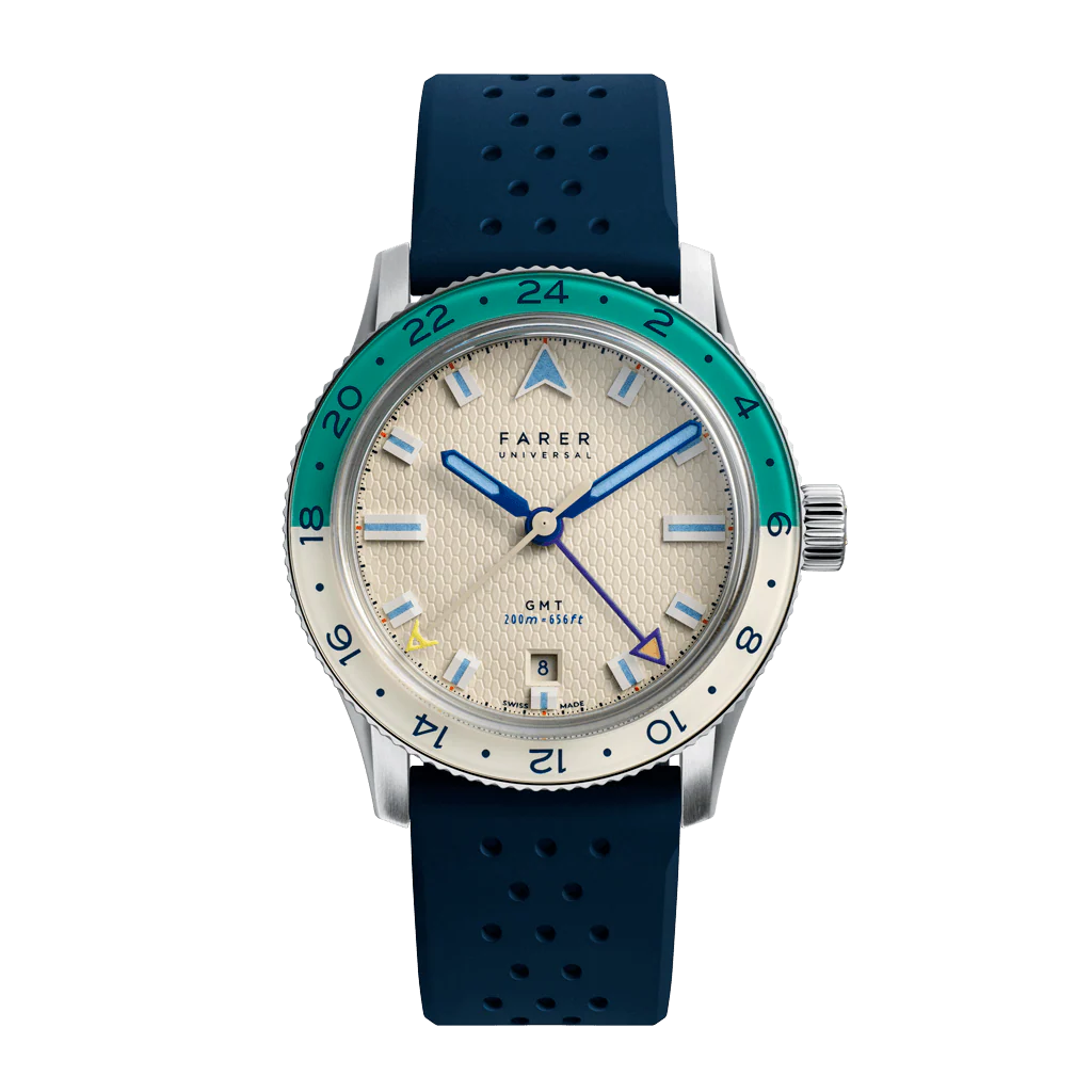 GMT watch with bidirectional rotating bezel with a green and cream sapphire insert. Bright blue hands and white markers.