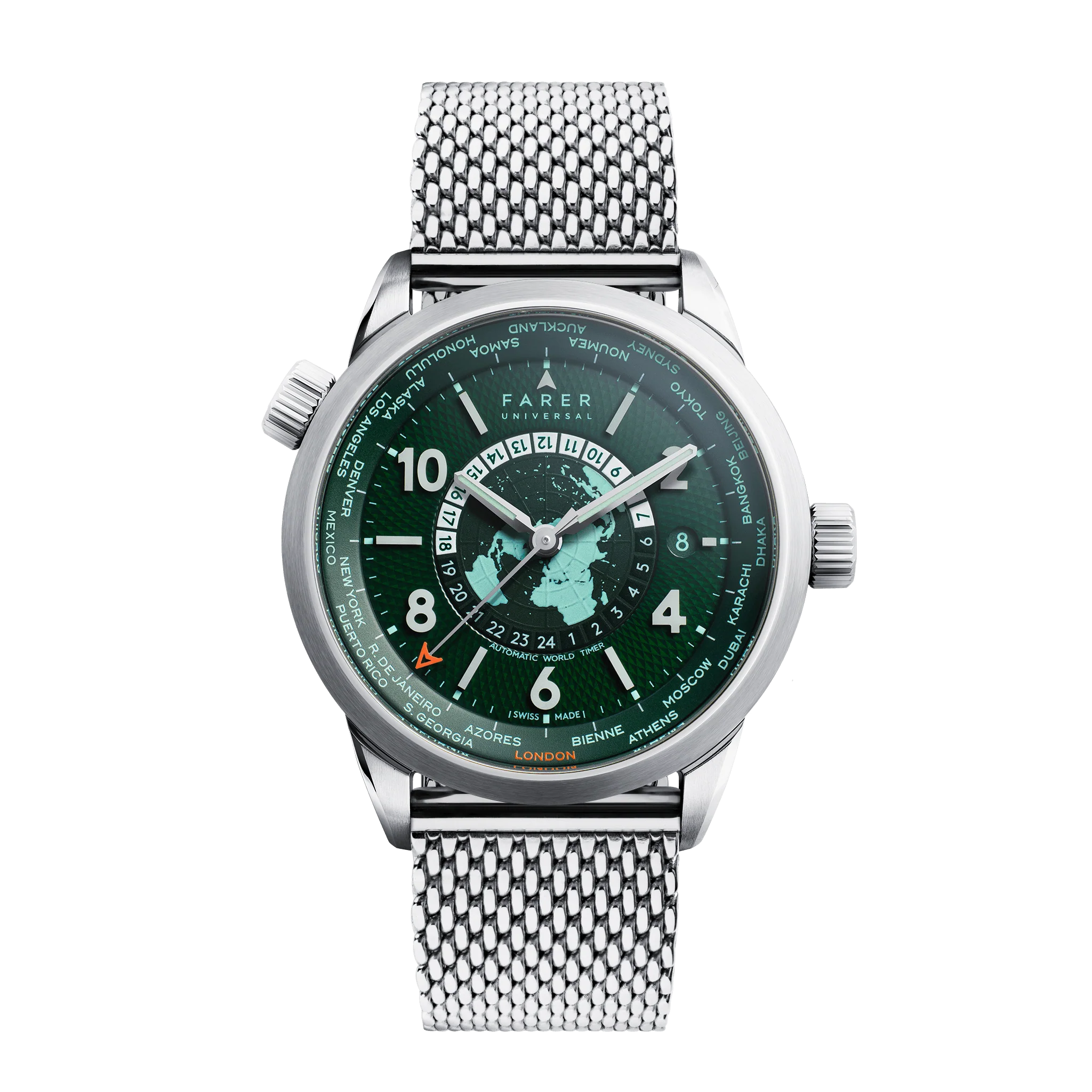 Guilloché pattern green dial with moulded white Lumicast markers, green and white 24-hour disk.