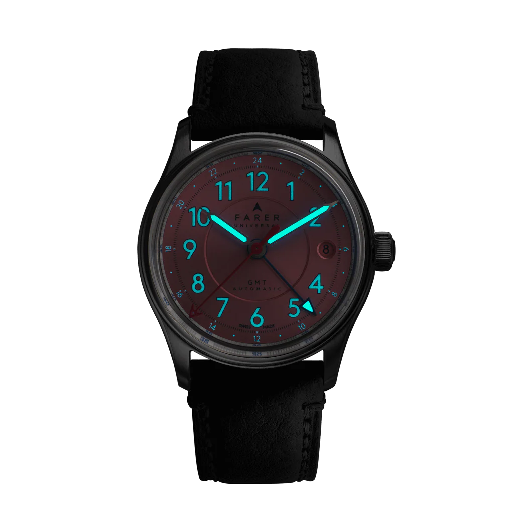 Automatic GMT dual time watch with date, pink sunburst dial and leather strap.