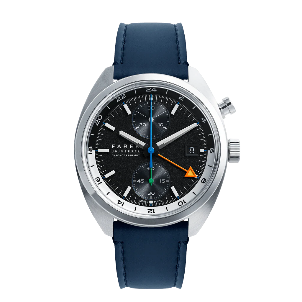 Monopusher chronograph and GMT watch with black gravel-textured dial and St Venere leather strap.