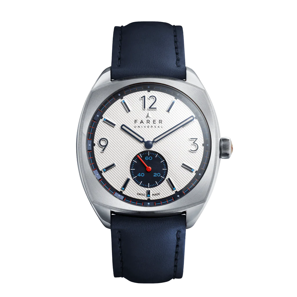 Hand-wound cushion case watch with piqué textured white dial and choice of strap.