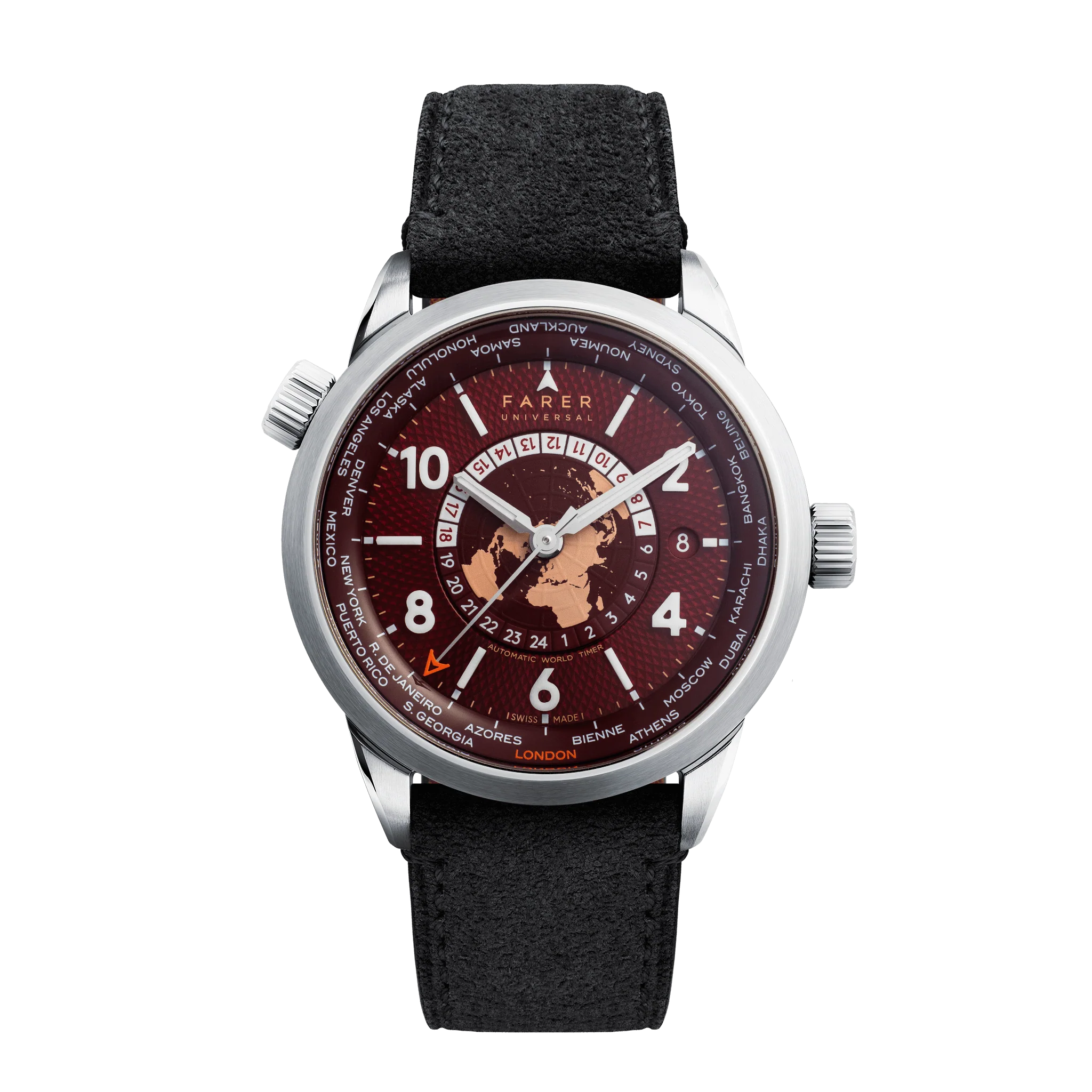 Guilloché pattern burgundy dial with moulded white Lumicast markers, burgundy and white 24-hour disk.